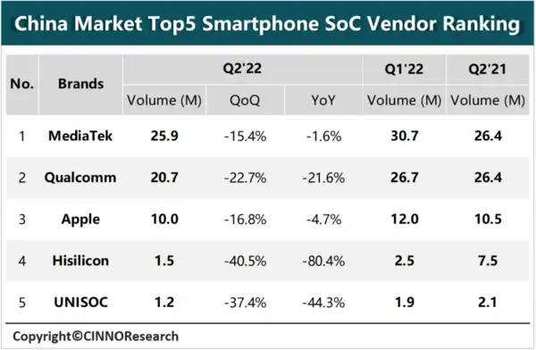 另一个方面,则是智能手机市场出现的明显萎缩。根据CINNO Research调查,受疫情、经济疲软、通胀等因素影响,2022年上半年中国智能手机销量约1.34亿部,同比下降16.9%,创下2015年以来最差的上半年销量成绩。受此影响,联发科第二季度出货量同比下滑15.4%。