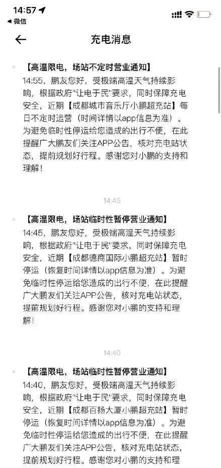而在社交媒体上,有网友也补充说他在近期收到来自小鹏的短信提醒,短信显示,受极端高温天气影响,小鹏位于成都的多个超充站近期采取不定时营业或暂停营业以保障居民用电。