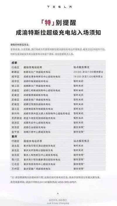 特斯拉官方发布的公告称,截至8月17日,成都地区14个超充站中,仅有两个(郫都百伦广场和成华龙潭寺)超充站保持营业,其余都处于服务受限或暂时关闭的状态,重庆地区超充站则均为服务受限或暂时关闭。