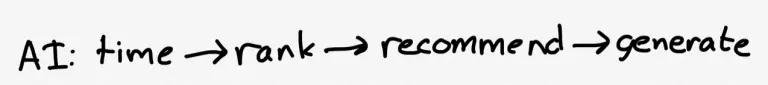 第二个趋势是人工智能的不断加入。我用这个术语泛指“计算机变得更智能和更有用”这个总体趋势,即便这些智能是简单算法、机器学习,或者,有朝一日某种接近通用智能的结果。说回 Facebook,原先它的网站一点也不智能:只是个人资料页面的集合。 后来 Twitter 出现,并推出了时间线,但它的唯一的智能之处在于能够读取时间戳:所有内容都按时间顺序呈现。 Facebook 的动态消息之所以行得通是运用了排名:从一开始,该公司就试图向用户展示他们认为你可能最感兴趣的网络内容,实现主要是靠简单的信号和权重。随着时间的推移,这种排名算法已经演变成一种机器学习驱动的模型,会根据每次的点击和逗留不断迭代,但局限在你所关注内容的有限集合。推荐则向前迈进了一步:内容池不再仅来自于你关注的人,而是整个网络上的内容;这对计算构成了挑战,因为数量级已经超过了单纯的排名(人工智能创作的内容又是一大进步)。