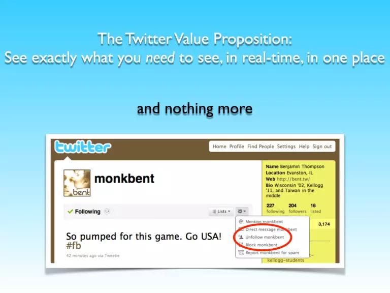 我那部分叫做“推特的价值主张”,我首先承认了在推特上可以发现大家午餐吃什么,接着指出“事实上,你可以在推特上找到任何你想要的东西,这是件好事。” Twitter 的价值主张是,你可以“在一个地方实时、准确地看到你需要看到的东西,仅此而已”;我给观众展示了如何取消关注我的过程,以此来说明这一点: