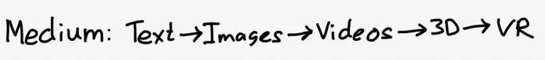 先从媒介开始:文本很简单,所以文本成为了互联网最早使用的媒介;实际上任何人都可以创建文本。这意味着什么?首先就是互联网上的文字比其他任何媒介都要多。相应地,高质量文字的数量也相应较多(就算相对占比不高,但绝对数仍然很大)。第二点与人工智能有关:AI 处理文字和获取洞察也更容易。与此同时,文本获得了人们的关注,用习得的技能去做出解释,其实与刻意移动鼠标,然后通过链接交互没有什么不同。