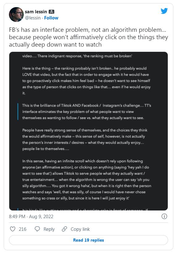 这就是 TikTok 与 Facebook/ Instagram 的挑战的精彩之处:TikTok 的界面解决了一个关键问题,也就是大家希望通过自己的关注/想看树立个人形象,但这个跟自己真正想看的东西是两回事……这(TikTok)并不是真正的算法升级,它只是缓解了那些为了找乐子而出现的人的紧张情绪。