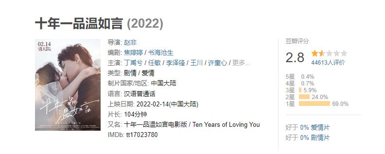 然而接力春节档的情人节档,口碑更是一塌糊涂。大IP网文改编的《十年一品温如言》豆瓣评分2.8;古力娜扎主演的《不要忘记我爱你》豆瓣评分3.1;端午档国产片总场次第一的《暗恋·橘生淮南》豆瓣评分也只有4.4分。