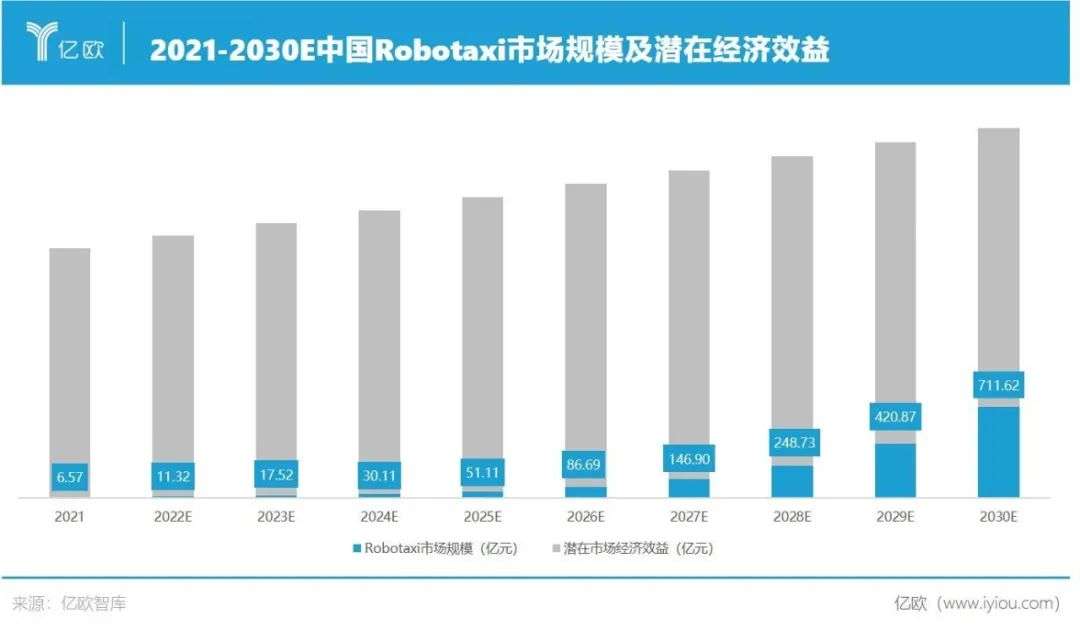 亿欧智库预测,到2025年,Robotaxi会实现大规模落地,至2030年,市场规模超过700亿元,经济效益达到近3000亿元。