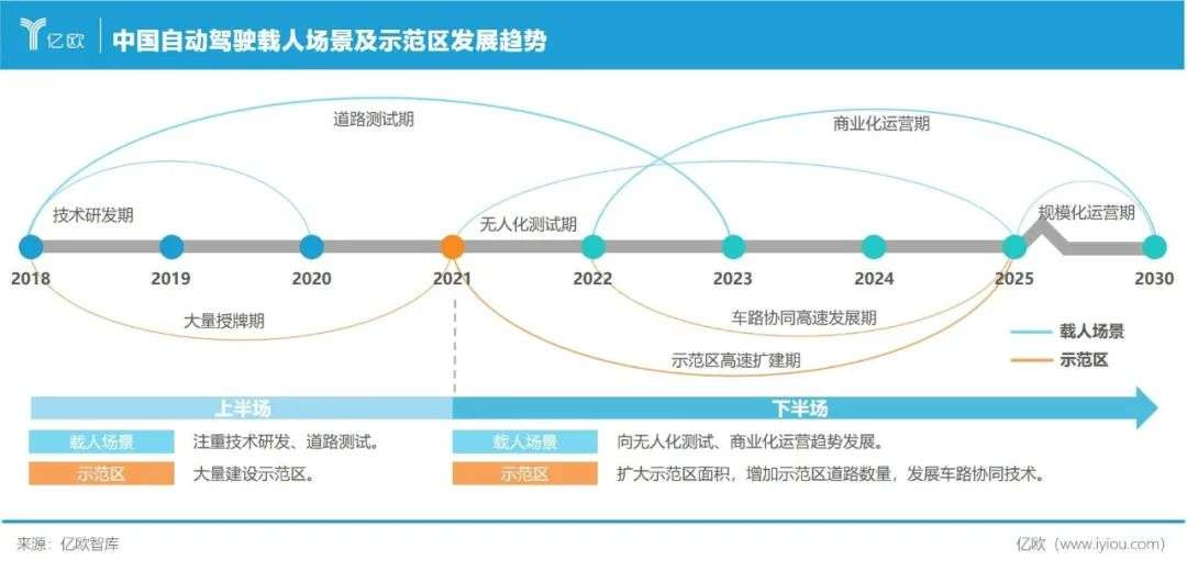在《2021-2022中国自动驾驶商业化系列研究—载人场景及示范区》报告中,亿欧智库将自动驾驶载人场景的发展,分为上、下两个半场,2021年是上下半场的转折点。