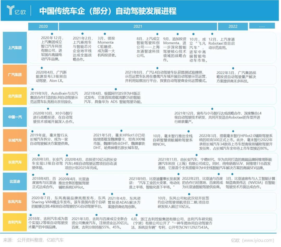 据亿欧汽车盘点,中国头部传统车企几乎都在自动驾驶的布局上热情高涨,动作不断,积极拉帮结派,在自动驾驶的市场上搅动风雨,生怕落他人之后,错过了这一风口。