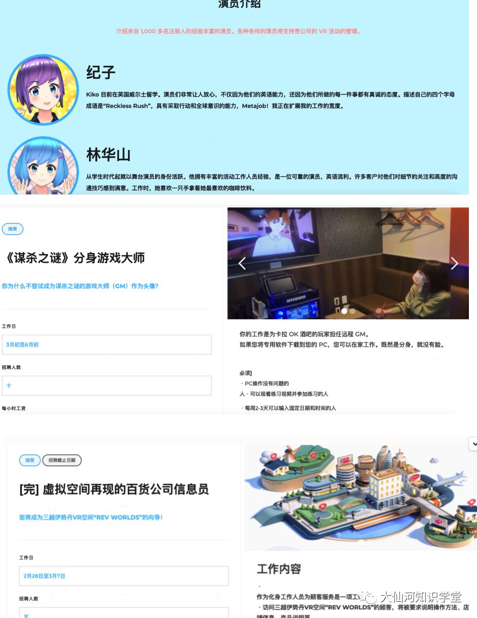 比如住在英国的纪子上午可以在东京的剧本杀馆担任DM(日本叫GM,DM只需要一个虚拟形象,主要靠声音和剧情推动,符合游戏的形象反而可以更好的让玩家入戏),下午在元宇宙招聘会担任会场引导工作者,晚上还可以做元宇宙伊势丹百货公司导购员。