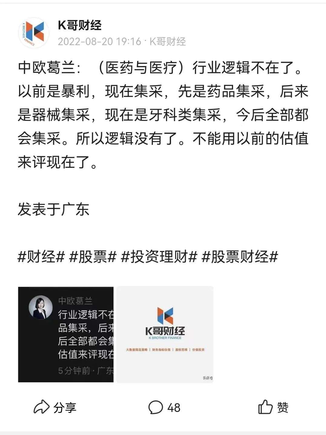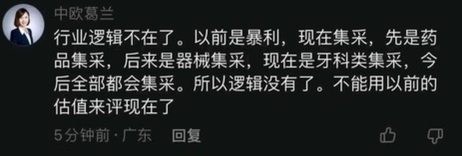 冒用“中欧葛兰”的账号,信息发布地址显示在广东。该账号指出“行业逻辑不在了。以前是暴利,现在集采,先是药品集采,后来是器械集采,现在是牙科类集采,今后全部都会集采。所以逻辑没有了。不能用以前的估值来评现在了”。