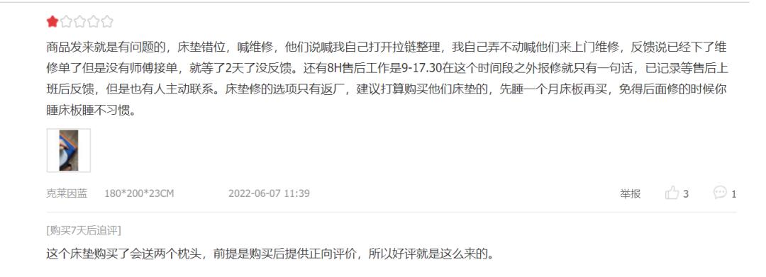 在8H京东自营旗舰店的8H蓝精灵床垫产品下,好评率为94%,也存在赠送礼品要求好评的现象。一位用户称,这个床垫购买了会送两个枕头,前提是购买后提供正向评价,所以好评就是这么来的。