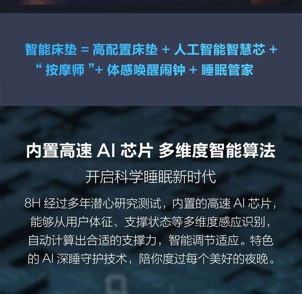 在京东的8H家居官方旗舰店,新浪科技看到了一款8H真皮智能电动床X Pro,售价近万元,提供AI睡眠监测、App/语音智能操控、电动升降等功能;还有一款8H智能床垫,售价超7000元,宣称内置AI芯片,可实现智能自适应。