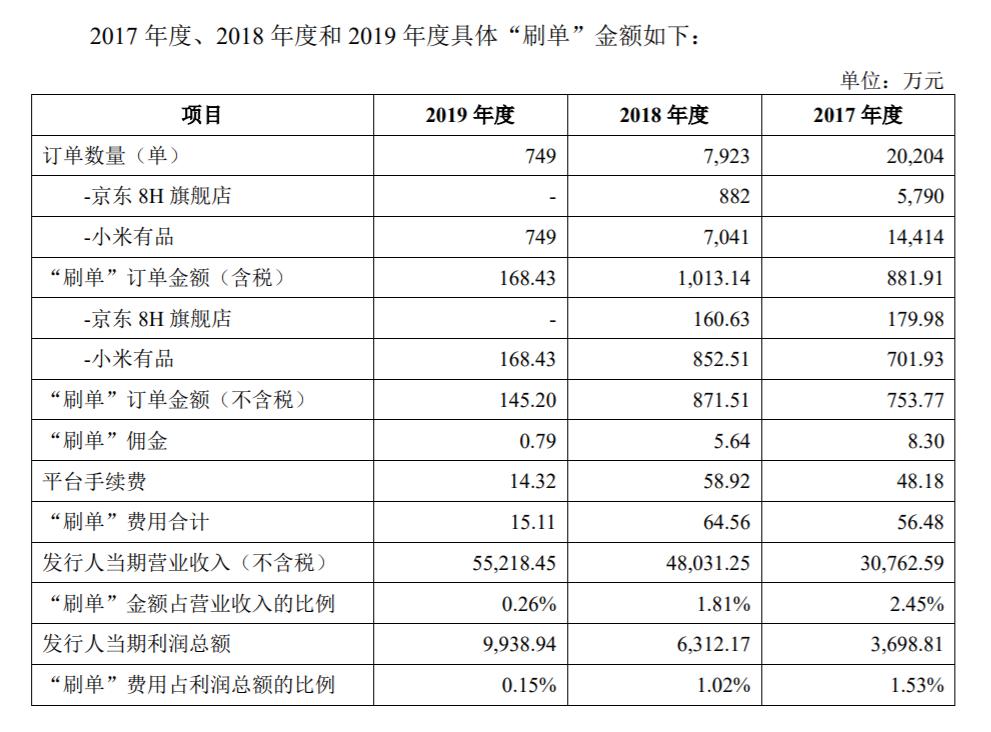 数据显示,2017-2019年,趣睡科技刷单订单金额分别为881.91万元、1013.14万元和168.43万元,占各期营业收入的比例分别为2.45%、1.81%和0.26%。