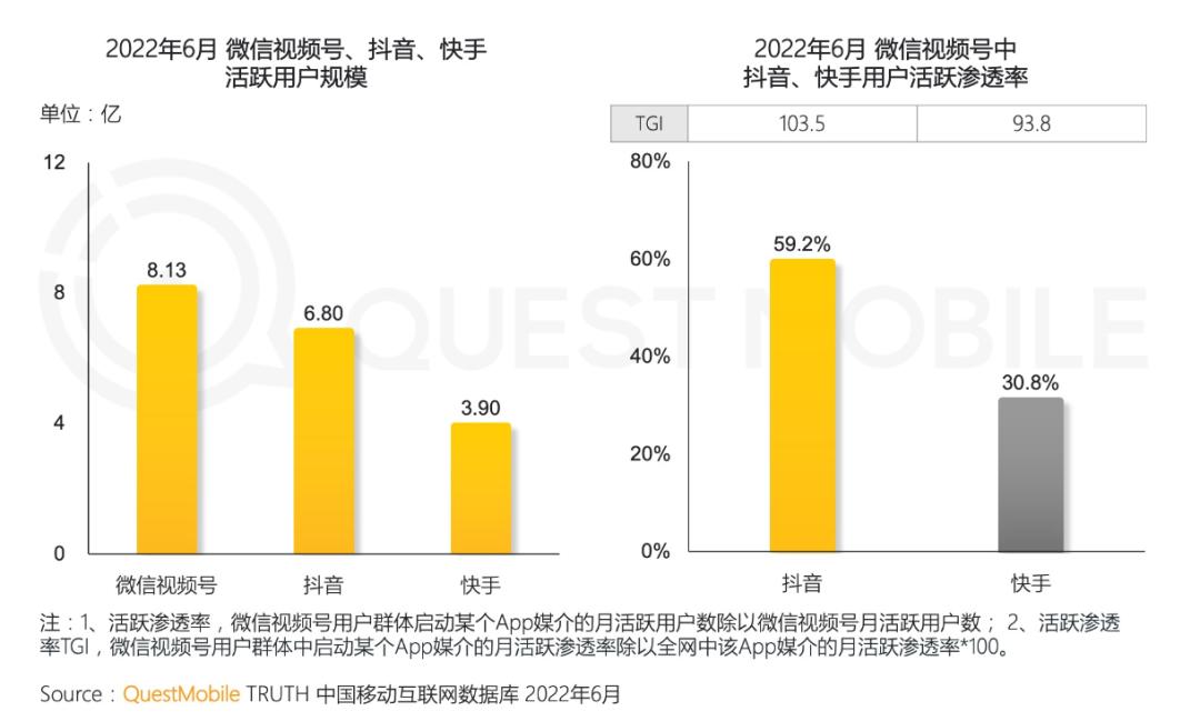 在中国,根据 QuestMobile,2022 年 6 月视频号、抖音和快手的日活用户数分别达到 8.1 亿、6.8 亿和 3.9 亿。
