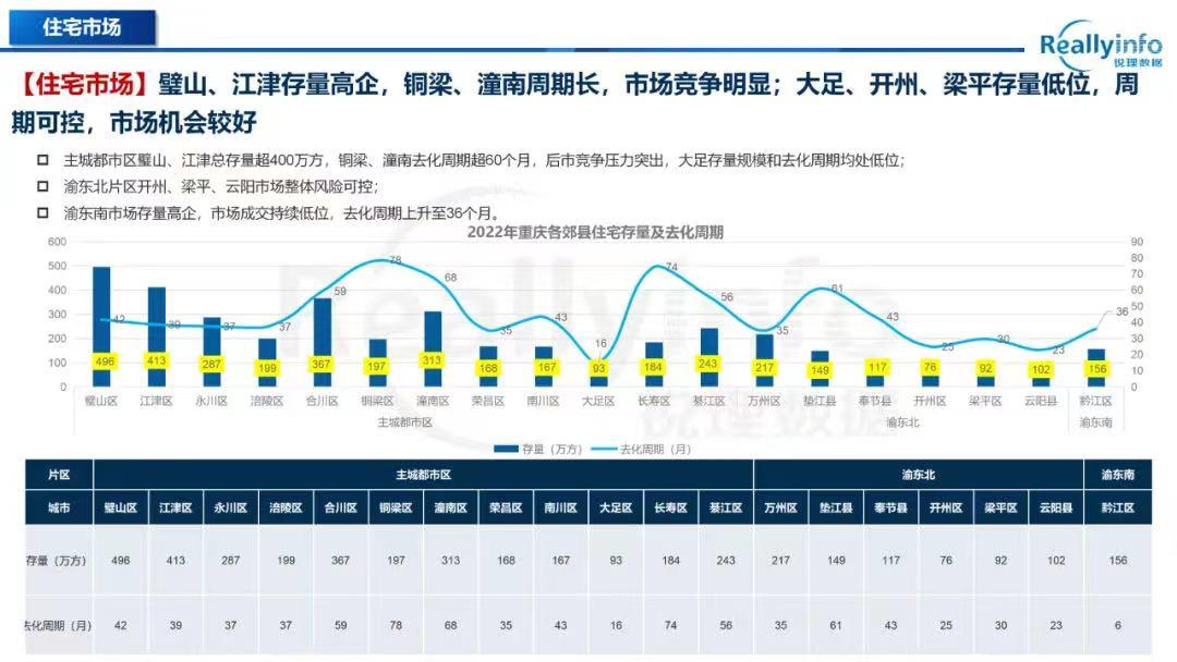 重庆当下全市的去化周期在10个月左右,主城12区和外围区县去化周期超长,。