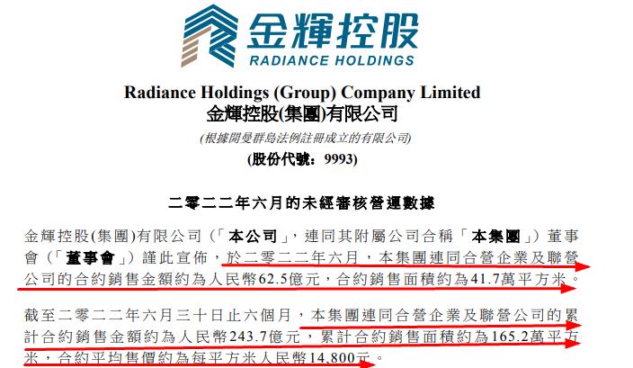 该项目背后的操盘手是金辉控股。根据金辉控股发布的半年报显示,2022上半年公司累计合同销售金额243.7亿元,同比下降56.3%;实现销售面积约165.2万平方米,同比下降48.7%。
