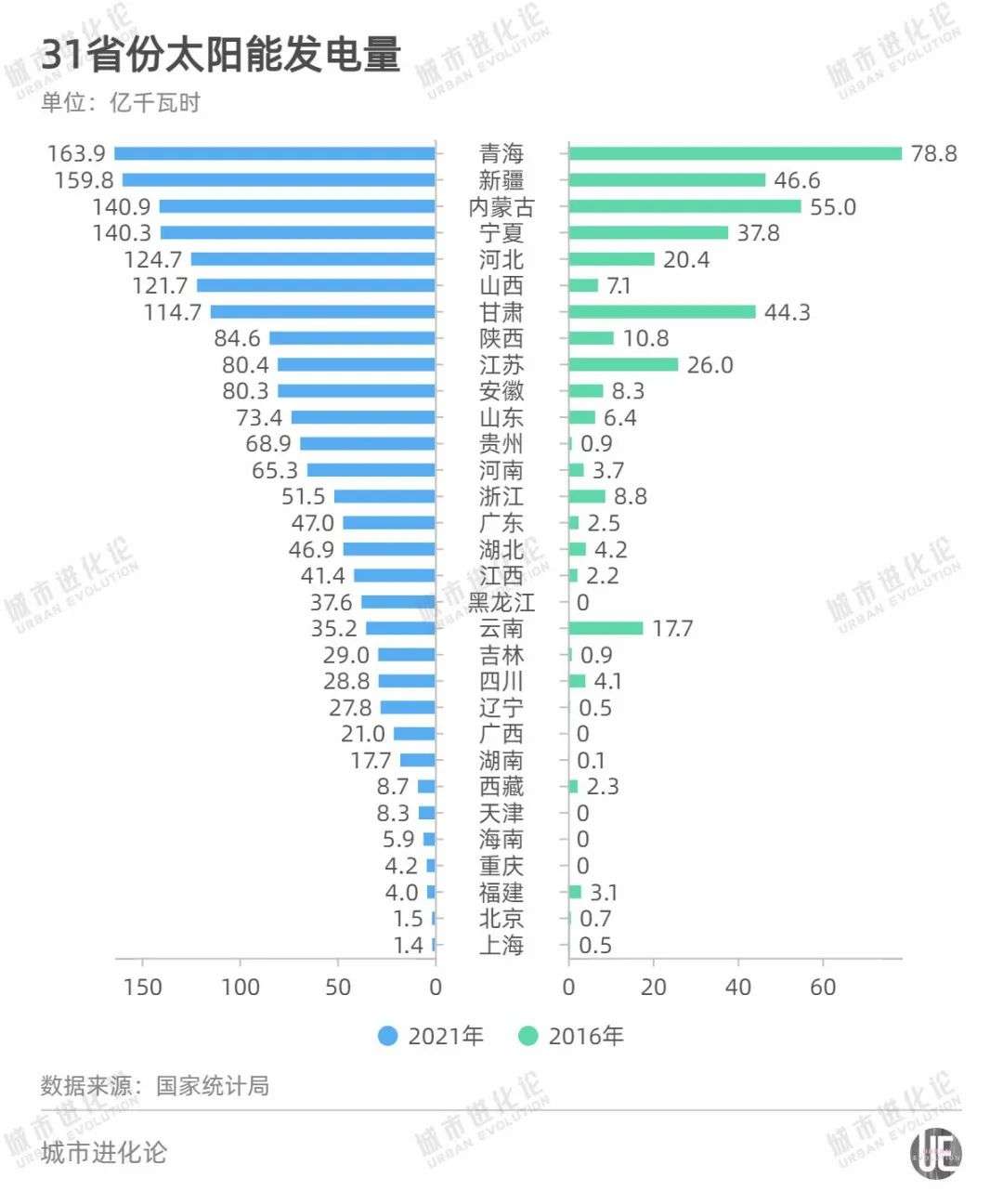 同年,太阳能发电量的前八名无一例外均被三北地区省份包揽,除青海居于第一外,新疆、内蒙古再次进入前三。