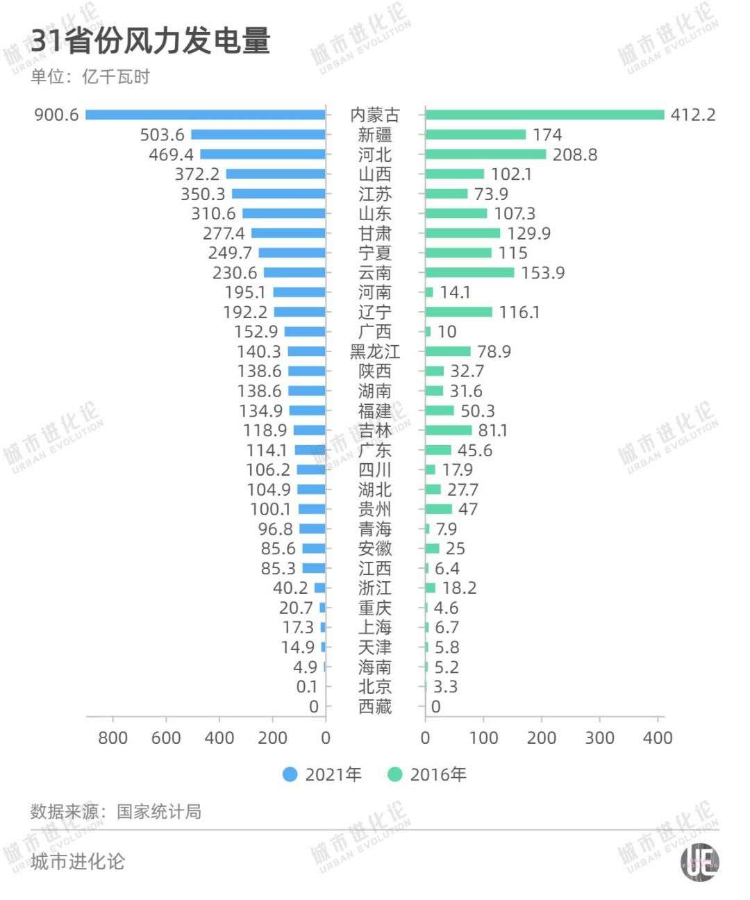 2021年,风力发电量前10名省份中,有8个都来自“三北”地区,内蒙古、新疆及河北分别位列前三。