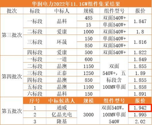 就连中环、通威这样素来坚守专业化道路的企业也开始在为垂直整合谋篇布局:8月19日,据华润电力公示的第五批光伏组件集采中标候选人,亿晶、隆基、通威三家企业入围此次集采,其中通威报价最低至1.942元/W,比亿晶/隆基报价低5分多钱。这被许多业内人士解读为通威有意大规模进军组件并掀起价格战的信号。