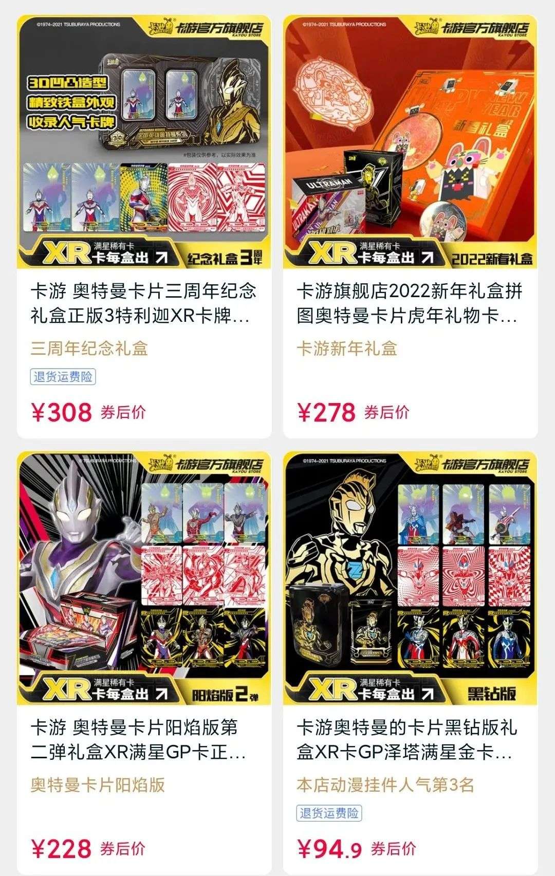 动漫卡游便是隶属于甲壳虫集团旗下的公司,拥有奥特曼等国内外70%以上的动漫IP授权,是占据了国内奥特曼卡牌市场90%以上份额的大玩家。在天猫和京东,如果搜索奥特曼卡片,排名靠前的商家在售的产品基本都来自卡游动漫。