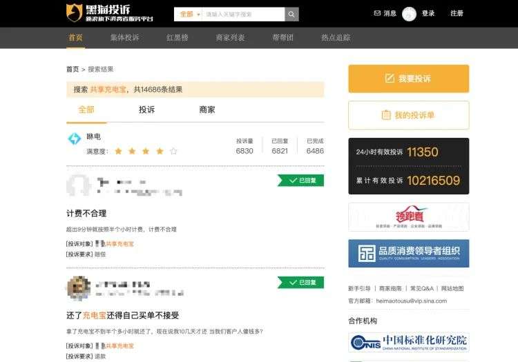 网上类似这样的吐槽还有很多,这也从侧面表示了目前很多消费者对共享充电宝的糟糕体验产生了抵触心理。在黑猫投诉上,搜索关键字“共享充电宝”能够得到14686条结果,很多投诉都是上游公司和代理商面对投诉不作为、计费混乱、产品质量不过关等等。