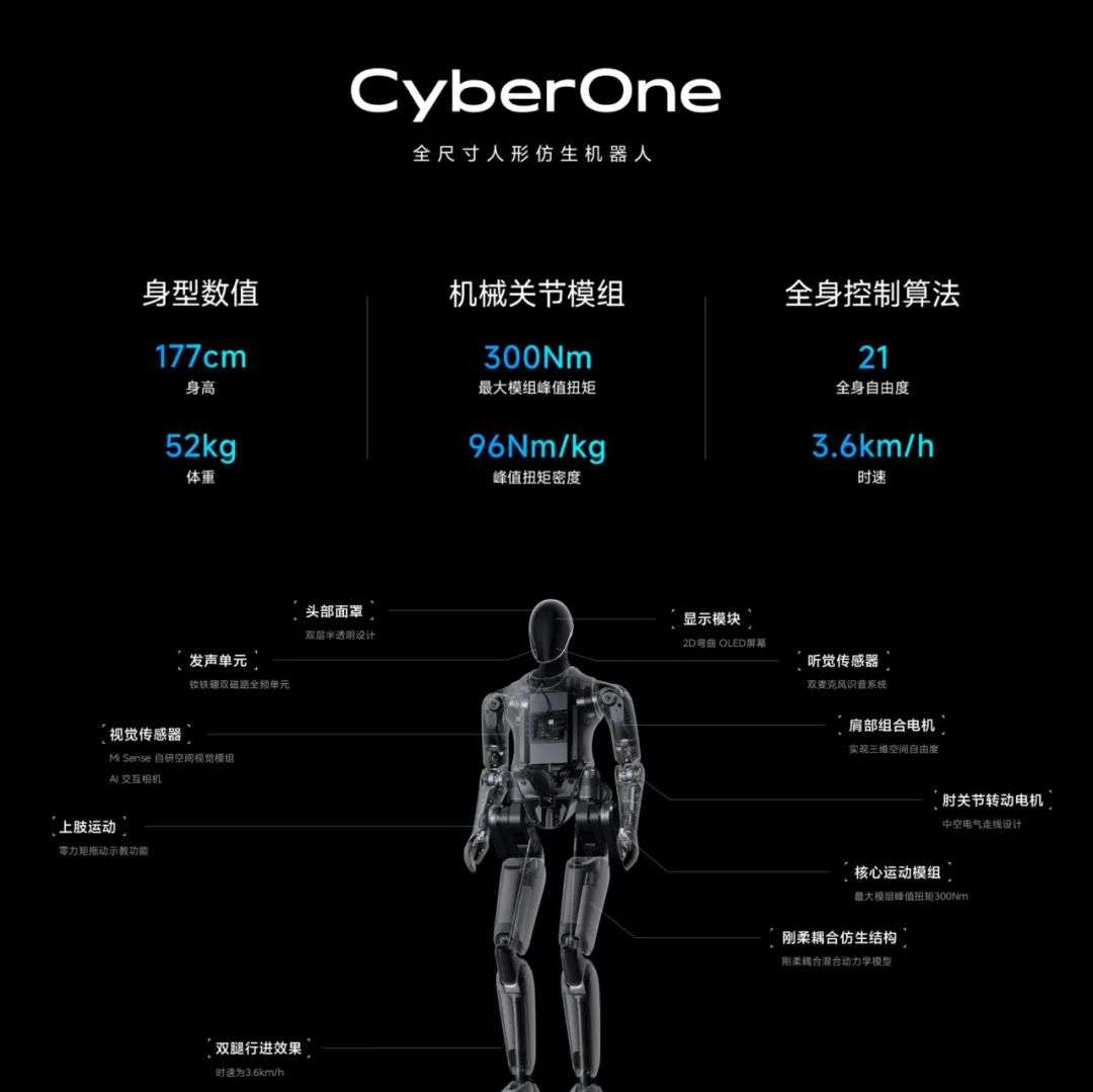 按照雷军在发布会上的说法,Cyber One由小米机器人实验室全栈自研完成,除了能实现双足运动姿态平衡外,四肢强健、动力峰值扭矩300Nm等四大技术能力外,还可感知人类情绪; 对真实世界三维虚拟重建。