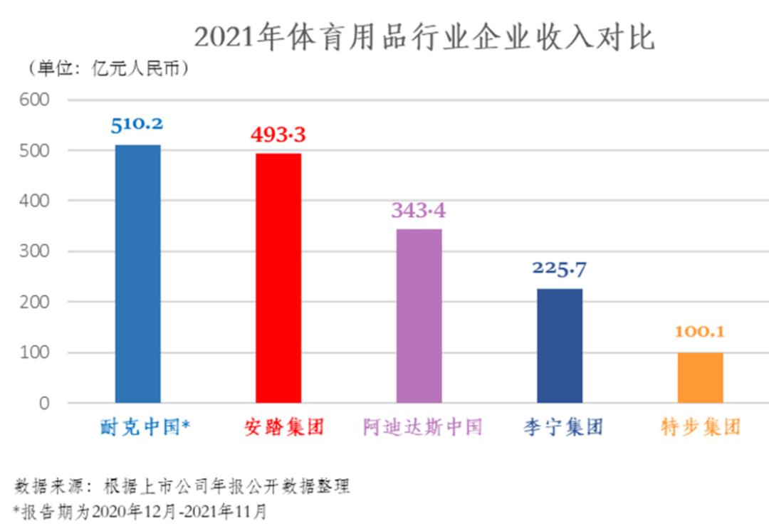 2021年运动品牌耐克中国销售超过510亿元,暂列第一。安踏销售493.3亿元位居第二。阿迪达斯销售343.4亿元。李宁和特步居第四和第五,李宁营收达到225.7亿元,特步为100.1亿元。前五名有三个国产品牌,除掉耐克阿迪外前五名都是国产品牌,借势国潮中国运动正在消费端快速崛起。