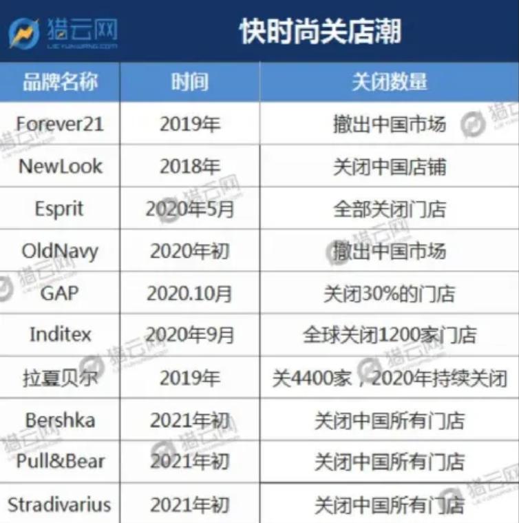 今年3月31日,H&M旗下的MONKI天猫官方旗舰店也正式关闭。快时尚品牌NEW LOOK、Topshop等多家品牌也陆续退出中国市场。
