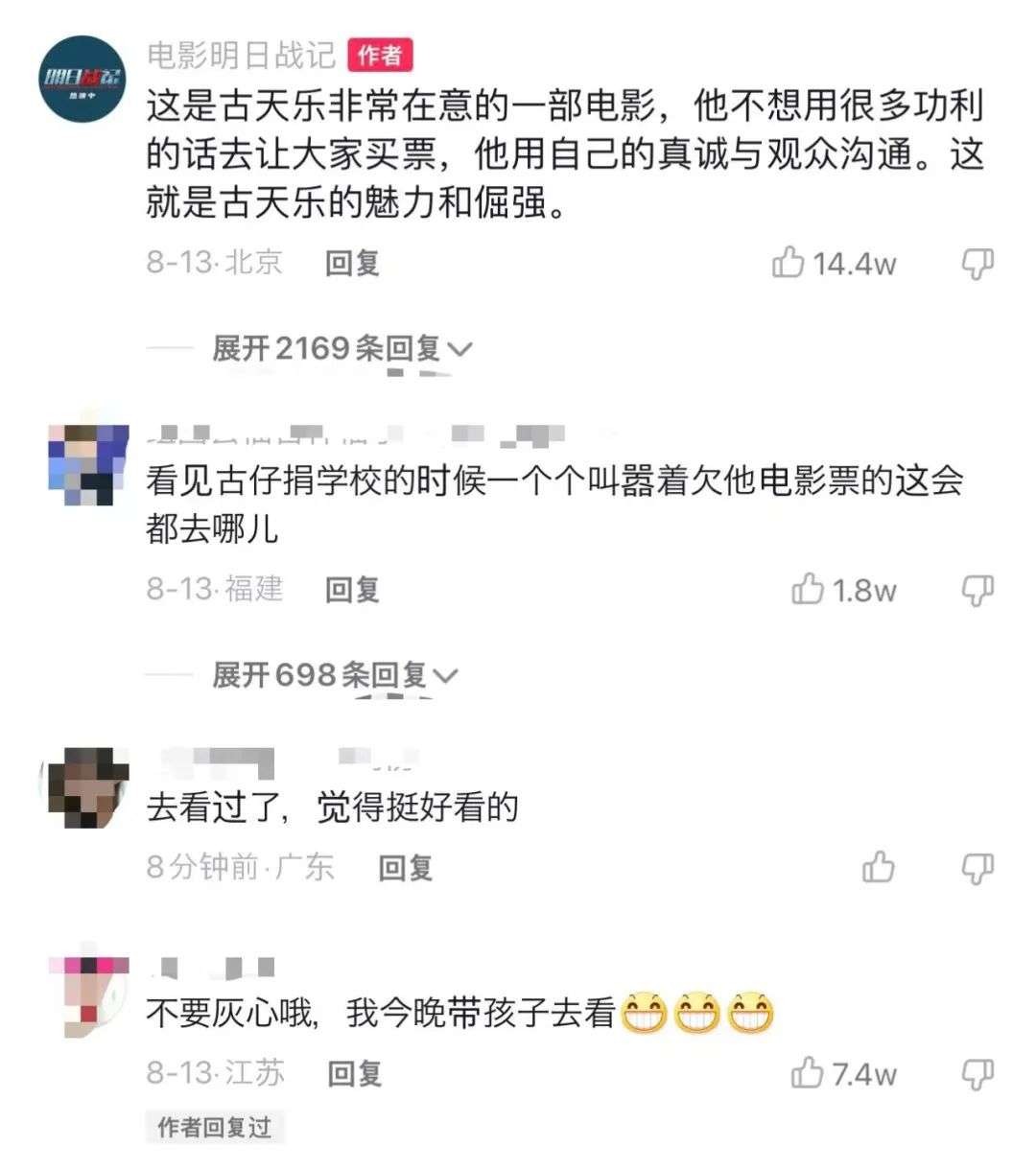 十几秒角色互换,拍出没人看的电影的古天乐暗自神伤,没买票进场的观众俨然成了辜负古天乐心血的“渣男”。而这样一条典型卖惨短视频,获得了高达135.7w的点赞,评论区里引来无数网友心疼支持,表示愿意买票进场。截至目前,该视频热度仍位居《明日战记》官抖物料热度第二位。