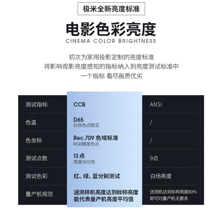 极米的做法与坚果有些不同,他结合了D65标准色温、色准指标、测试点数等多个维度,制定了全新的CCB亮度标准,用以代替投影行业通用的ANSI亮度标准。各项指标测试均控制在6500K标准色温环境下,之后再对亮度、色准、亮度均匀性逐一测试,最后给出综合得分。其发布的H5投影仪就达到1300CCB流明,画质表现似乎比标称3200ANSI流明的产品更为出众。
