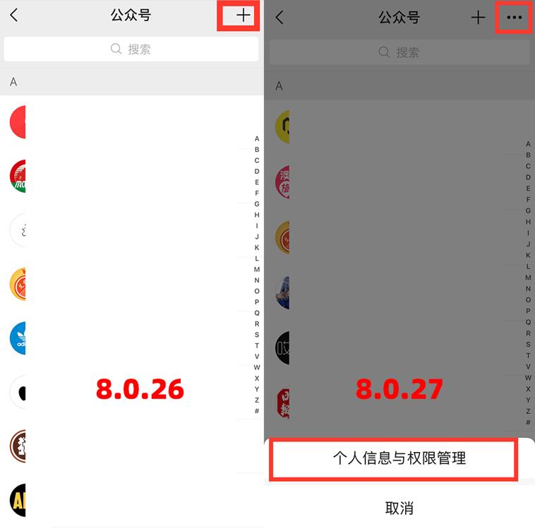 这次更新在 “通讯录——公众号” 中加入了 “个人信息与权限管理” 。