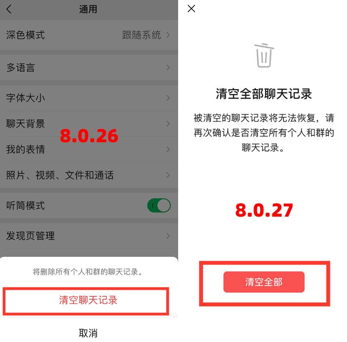 相比之前点击清空全部聊天记录后直接弹出提示清空全部。