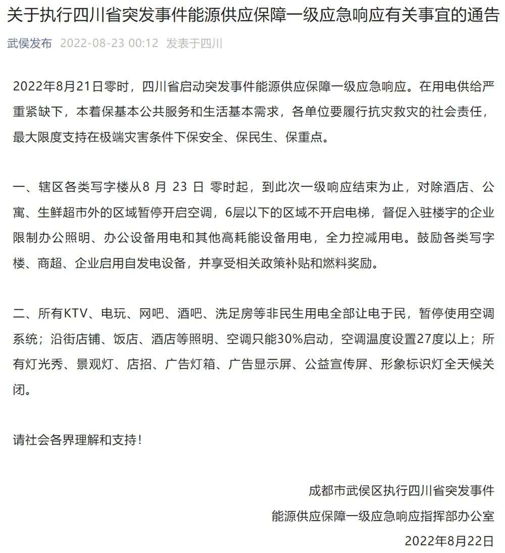 刚刚过去的这个周末,很多成都人都接到单位通知,自周一22日起,留少数人轮岗值班,大部分人居家办公,写字楼中央空调要暂停开启、6层以下不开电梯、照明和其他高耗能设备控减用电,直至一级应急响应结束为止。