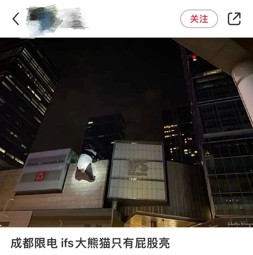 走到地面上,IFS也不再灯火通明,“灯光师”给那只爬墙的熊猫留了一束追光灯,恰好打在它的屁股上。有人调侃,这画面就像是国宝越狱被抓,“你已被包围,立即投降”。