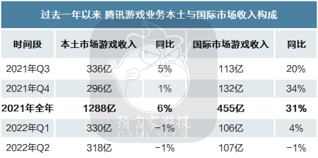 从2021年Q3财报开始,腾讯就调整了游戏营收的统计方式,首次按地域划分,区分了“本土市场游戏”和“国际市场游戏”。因此我们不妨来看看过去一年以来腾讯游戏业务在本土市场收入与国际市场收入的情况——