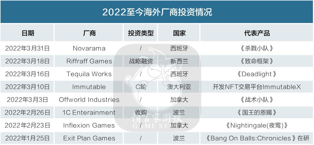 从腾讯在游戏领域的投资版图来看,数量更是急剧锐减——据统计,腾讯针对游戏领域的投资事件数量从2019年的9起,到2020年的33起,而到了2021年,腾讯的投资步伐由行走改为奔跑,共收购或投资超过100家游戏公司,相当于每3天一家,而且大约有30%是海外标的交易。但到了2022年,腾讯的投资步伐迎来了急刹车,至今已过了大半年,投资数量加起来只有10起。其中两家国内游戏厂商分别是四维八方与乐动卓越,另外8家为国外游戏厂商。