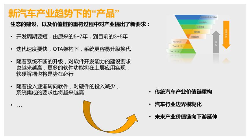 2. 汽车生态的建设、以及价值链的重构过程中对产业提出了新要求:开发周期要短,由原来的5~7年,到目前的3~5年;迭代速度要快,OTA架构下,系统更容易升级换代;随着系统不断的升级,对软件开发能力的建设要求也越来越高,更多的软件功能将在上层应用实现,软硬解耦也将是势在必行;随着投入逐渐转向软件,对硬件的投入减少,系统集成的要求也将越来越高。