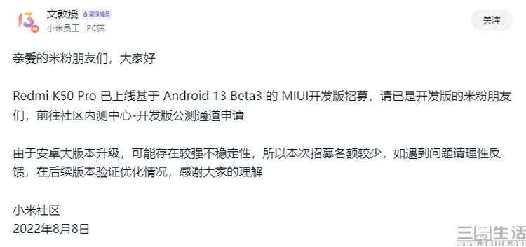 相比之下,今年MIUI基于新版系统的内测虽然更早(8月中旬小米12系列首发),但官方曾明确表示其基于“Android 13 Beta3”。