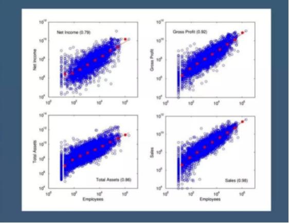 净收入、总利润、总资产、销售额这四大因素都跟雇员人数存在亚线性增长的规律。