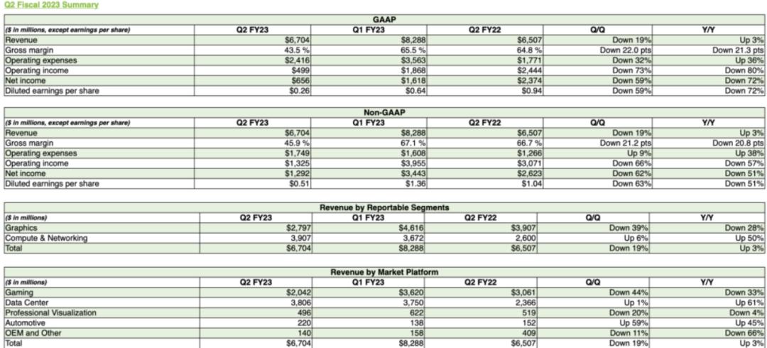 周三美股盘后,英伟达公布2023财年第二财季业绩。其第二季度营收与每股收益均逊于华尔街预期,股价盘后大跌6%。符合我们昨天公众号的预测,有兴趣可以看一下昨天我们发布的文章。