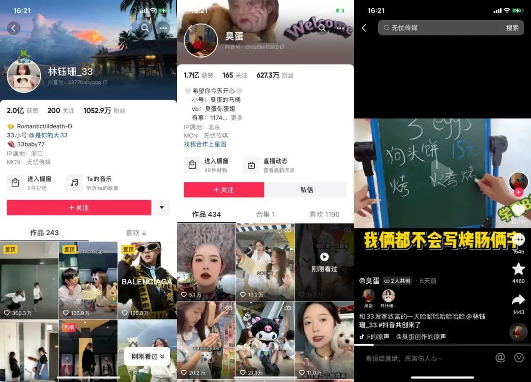 无忧传媒旗下达人臭蛋与林钰珊_33共创的内容——公司摆摊日记,近7天为其分别带来了4,334和7.6万的新增粉丝。