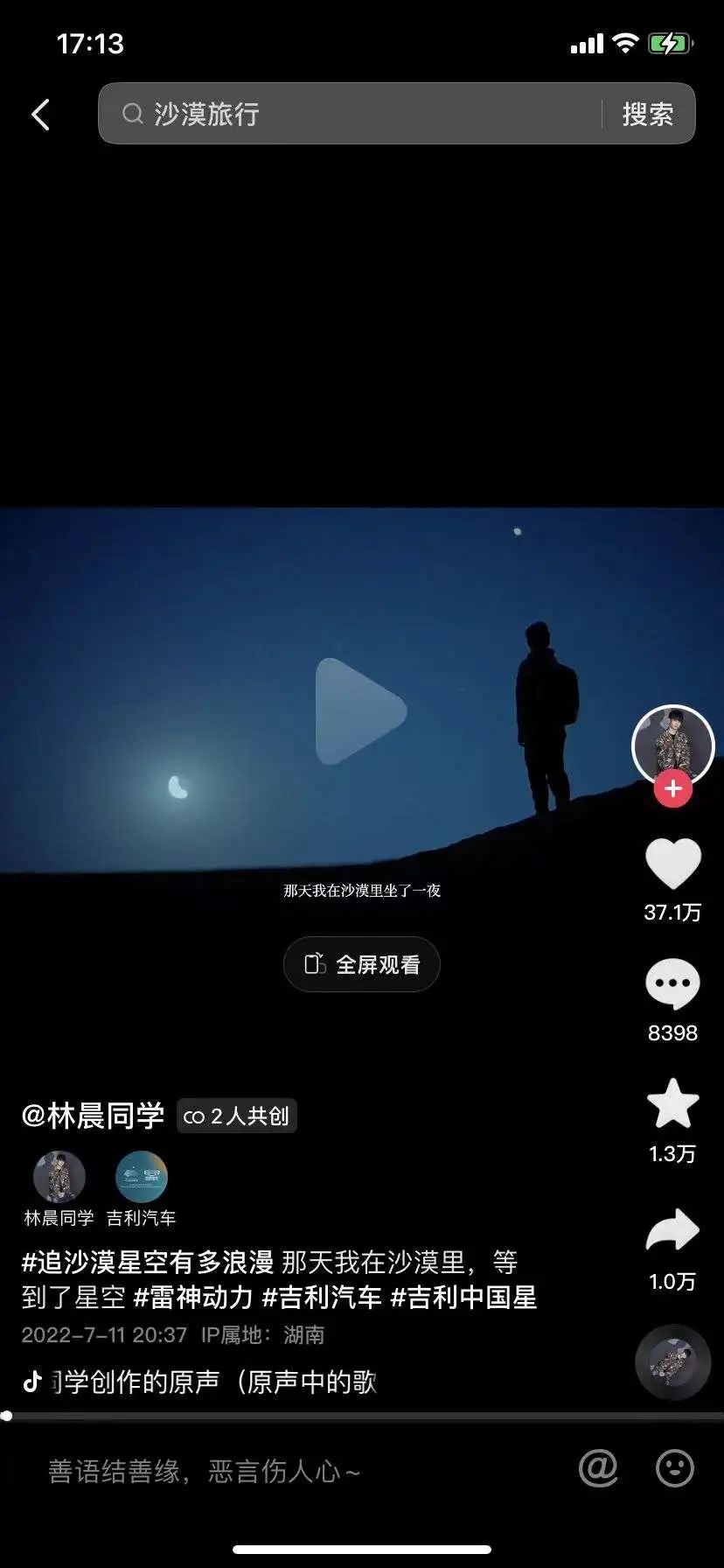 这条作品是林晨和“吉利汽车”品牌的共创视频,为品牌方带来了双重流量曝光,也让品牌账号有机会获得更多高黏度粉丝。截至发稿,这条视频获赞超37万,是“吉利汽车”近三个月获赞最高的视频,同时,#追沙漠星空有多浪漫登上抖音同城热榜。