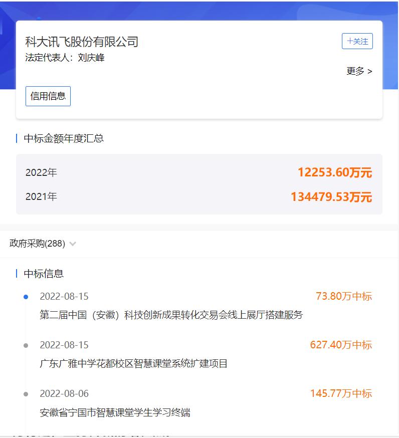 (科大讯飞近两年中标数据 图源:投标人在线)