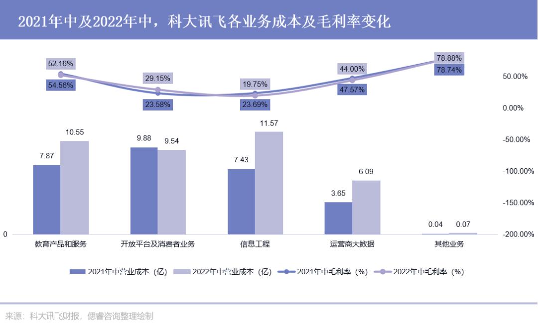 此外,信息工程及运营商大数据毛利率也分别呈现出不同程度的降低。其中,信息工程这个营业利润倒数第二的业务,成本大幅增长:从2021年中的7.43亿元增长至今年年中的11.57亿元,涨幅高达55.72%。