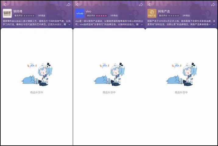 进入这些品牌的主页,可以看到虽然其中不少品牌还未上传商品,但不难看出B站电商并不是只有二次元商品,同时平台对于很多品牌而言还是有吸引力的。