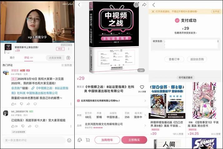 如今的B站会员购,不仅在APP主页底部有独立入口,同时还增加数码装备、图书等类目的商品。以UP主郭甜茶为例,她自己撰写的《中视频之战:B站运营指南》在上架B站会员购商城后,就可以直接在站内完成购买。