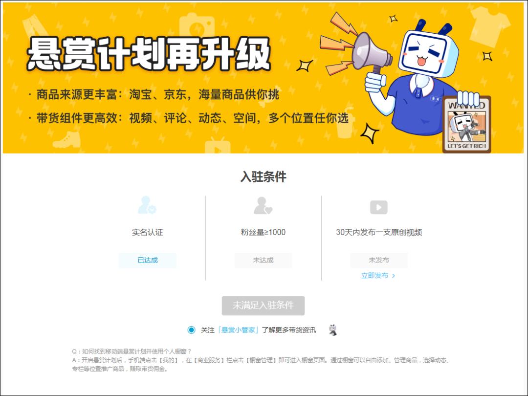 2020年7月,B站对“悬赏计划”进行了升级,开始发展在视频中挂小黄车、购物链接等更直接的带货模式。如今只要账号满足:1.实名认证;2.粉丝量≥1000;3.30天内发布一支原创视频,就能入驻平台的悬赏计划。