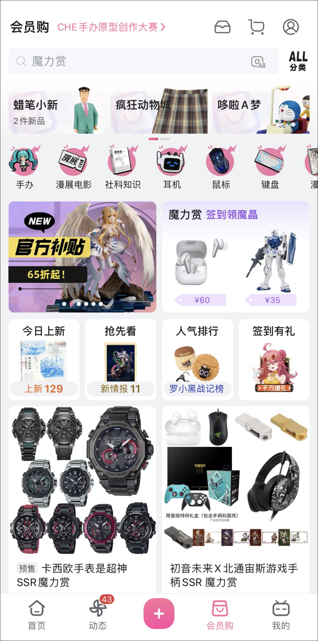 除了没有主流的店铺体系外,还有比较明显的一点是,在B站会员购主页,顶部黄金流量入口的位置,放置的是二次元圈层里特有的——魔力赏。