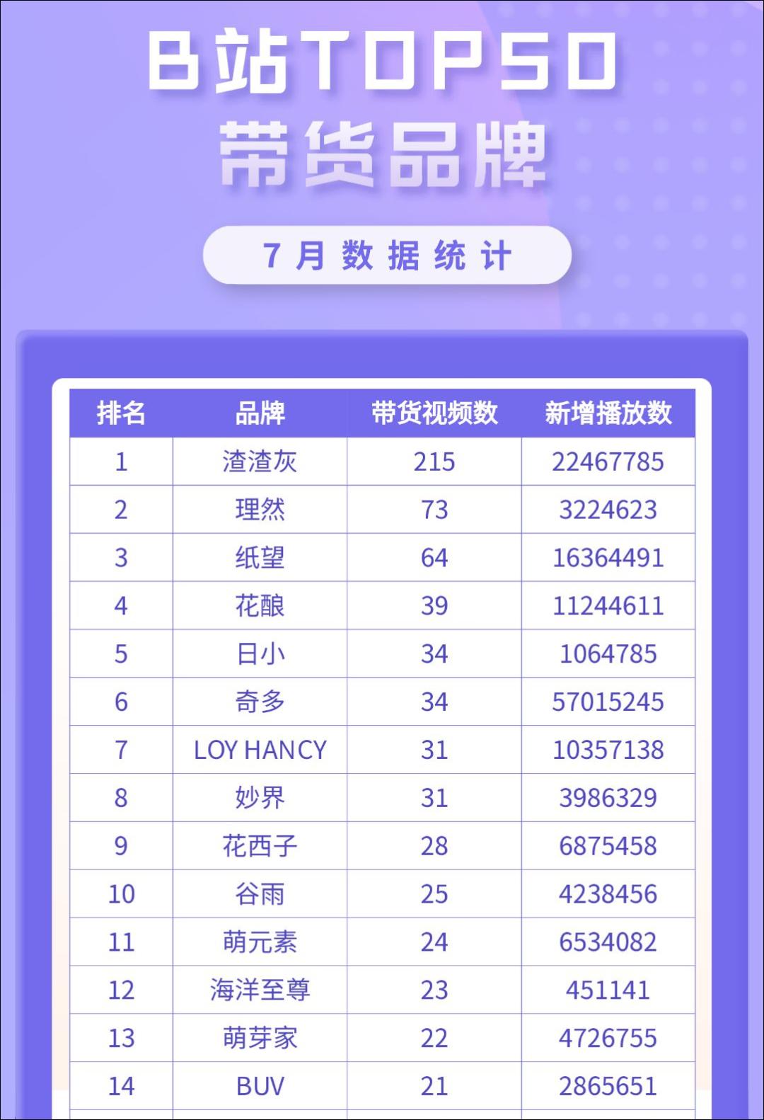 但是,品牌们对于一直对电商态度暧昧不明、对电商变现仍处在摸索中的B站,也不愿意贸然做出尝试。在上述带货报告中的Top50品牌榜单中,排名第一的品牌渣渣灰,在7月也只有215条带货视频。
