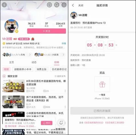 而且,时至今日,B站直播分类中都还没有出现购物或者电商相关的标签,带货直播间还没有明显的公域入口,做直播带货的UP主需要发布预告视频、设置预约直播抽奖的方式来为直播间引流。