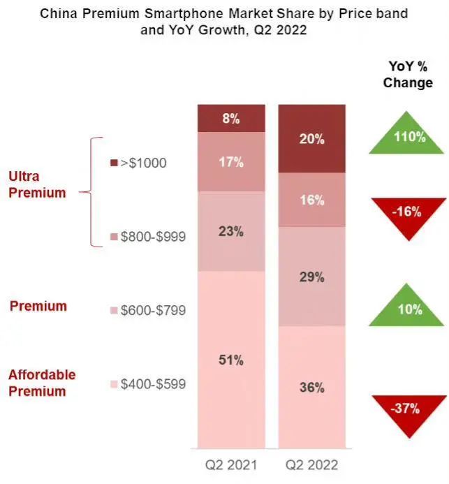 600美元~799美元(约合人民币4100元~5480元)价位手机销量同比增长10%,1000美元以上(约合人民币6840元)手机销量同比增长110%。出现这种情况的原因在于经济萎缩,厂商认为应该走平价路线,但性价比旗舰,也就是2750元~4100元这片市场不上不下,有钱人看不上,穷人舍不得花那么多钱,所以份额下降最为严重。